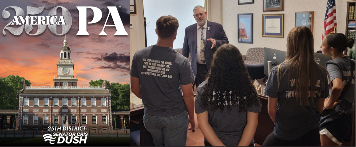 Win Student Essay Contest Attend America250PA Ceremonial Celebration National Constitution Center (Philadelphia)On Tuesday May 5, 2026, the Pennsylvania State Senate will be participating in a ceremonial celebration event at the National Constitution Center in Philadelphia to commemorate the 250th anniversary of the Declaration of Independence. We are honored to partner with America250PA to invite one student and their parent or guardian from each Senate district to take part in this historic occasion. Senate District 25 high school students (grades 9th through 12th) who may have an interest in government or civic engagement are encouraged to apply to be part of this historic ceremony. Because we anticipate a significant number of students will apply to be considered for this honor—and to help a panel select a winner—I am asking all interested students to submit a short essay on the theme below to https://senatordush.com/america-250-anniversary/. Essay Theme: “What was unique to the general character of The Founders at the time of the Declaration of Independence and the Constitution of the United States that differentiates them from those at the formation of any other nation?” All essays must be submitted no later than Wednesday April 1, 2026 at 12 a.m. This is a rare and meaningful opportunity to represent the 25th Senatorial District at a once-in-a-generation commemoration of America’s founding. Again, please visit https://senatordush.com/america-250-anniversary/ for further details about contest requirements, any updated travel information and to submit your essay by Wednesday, April 1. Should you have any questions, please do not hesitate to contact us. Complete district office contact information is available here. Welcome to Your State CapitolOn Monday, I had the privilege of welcoming Henry “Hank” Lustig to the Big 33 Football Classic Celebration at the PA Capitol. Hank is a standout 2026 wide receiver/cornerback from State College Area High School who committed to Penn State University as a preferred walk-on in January 2026. He earned first-team All-State honors in 2025 with 642 receiving yards and 11 total TDs. Congratulations Hank on all your well-deserved accolades as a premiere student athlete and best wishes for future success. The Big 33, known as the Super Bowl of High School Football, is an exciting matchup featuring PA vs. MD. For more information visit Big33.org. Senate Acts to Address Electric Generation Shortfall, Expand Energy Development